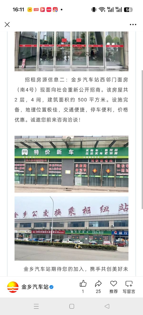 [出租] 金乡汽车站门面房招租;招租房源信息一:金乡汽车站原售票厅,一层,建筑面积128㎡。现面向社会招租!地理位置优越,人员密集,价格优惠!诚邀您前来咨询洽谈! 租房源信息二:金乡汽车站西邻门面房(南4号)现面向社会重新公开招商。该房屋共 2 层,4 间,建筑面积约 500 平方米。设施完备,地理位置极佳,交通便捷,停车便利,价格优惠。诚邀您前来咨询洽谈!垂询电话:15 [03-09]