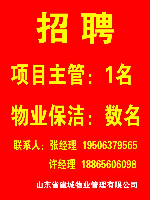 山东省建城物业管理有限公司招聘保洁数名、项目主管1名,工作地点:济宁教育学院金乡校区